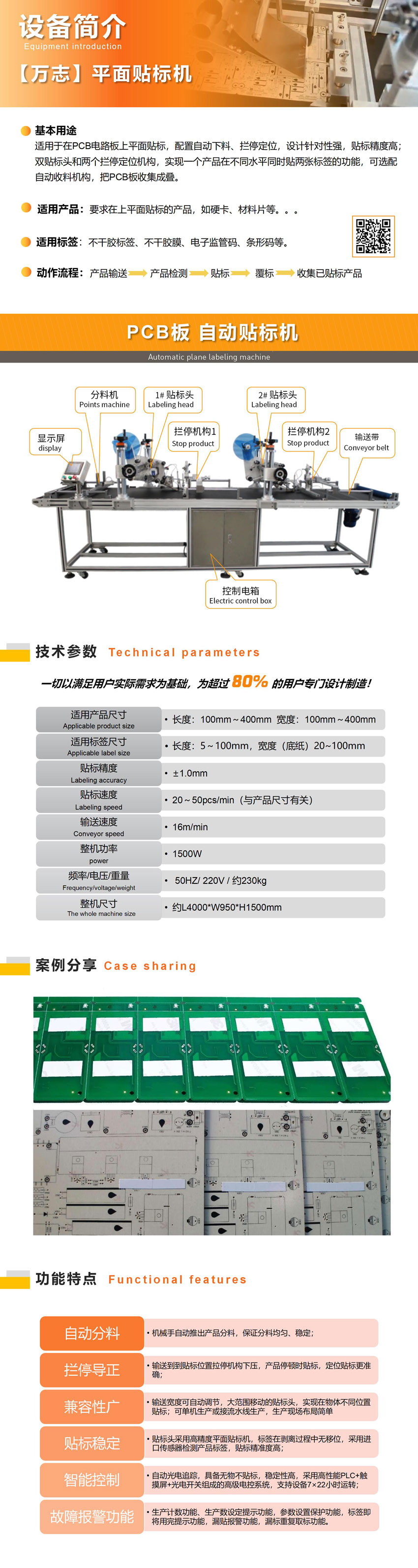 適用於(yú)在PCB電路板(bǎn)上平(píng)麵貼標,配置自動(dòng)上料、攔停定位貼標精度高。雙貼標頭和兩個攔停定位機構,實(shí)現一個產品(pǐn)在不同水(shuǐ)平同時貼兩張標簽的功能(néng);可選配(pèi)自(zì)動收料機構,把PCB板收集成疊。