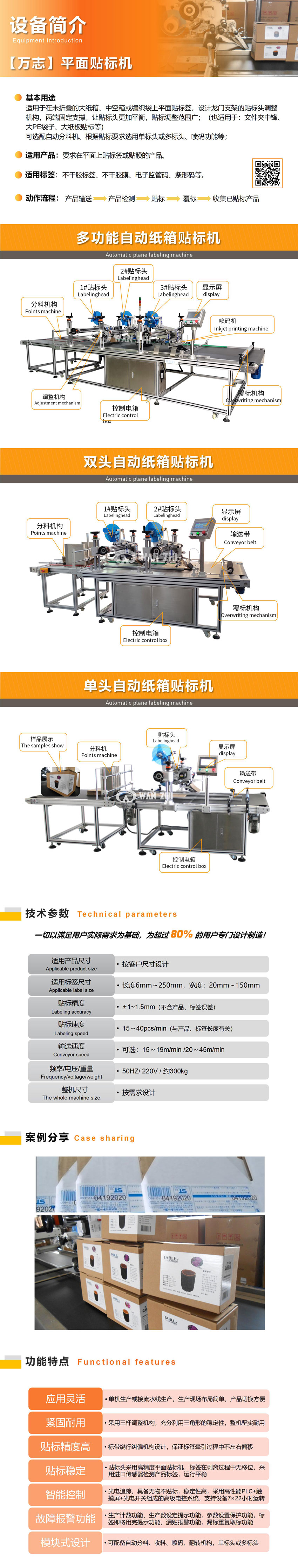 全自動紙箱貼標機適(shì)用於在未折疊的大紙箱、中空箱或(huò)編織袋上平麵貼(tiē)不幹膠標簽,設計龍門支架的(de)貼標頭調整機構(gòu),兩端固定支撐,讓貼標頭更加平(píng)衡(héng),貼標調(diào)整範圍廣,最大(dà)範(fàn)圍到寬度為800mm紙箱;可根據貼標要求做單標頭、雙標頭或多(duō)標頭;可(kě)根據用戶需求配備自動分料機構、收料(liào)機構、翻轉機構。(可同時應用於:文件(jiàn)夾中鋒貼標、大(dà)PE袋子貼標、大紙板貼標等)。
