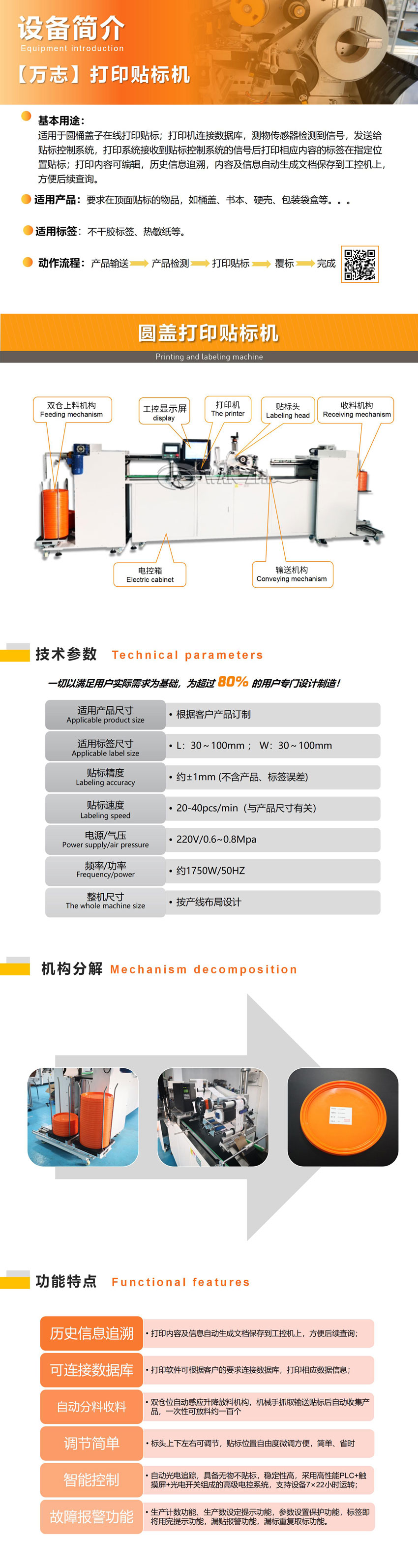適(shì)用於產品頂麵打印貼標,打印機連接(jiē)數據庫,打印係統接收到(dào)PLC的信號後打印相應(yīng)的內容;曆史信息追溯,打印內容及信息自動生成文檔保存到工控機上,方便後續(xù)查(chá)詢;