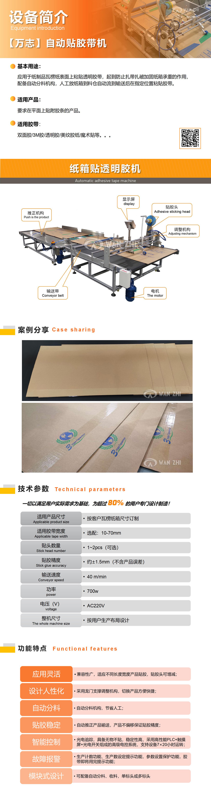 應用於紙製(zhì)品瓦楞紙表麵上(shàng)粘貼透明膠帶(dài),起到防止紮帶紮破加(jiā)固紙箱承重的作用,可配備自動(dòng)分料機構,人(rén)工放紙箱到料(liào)倉自動流到輸送後在指定位置粘貼膠帶(dài)。適用於在(zài)各種物(wù)品的上平麵粘雙麵(miàn)膠/3M膠,根據貼膠長(zhǎng)度要求自動裁切;如(rú)海報、紙卡、盒子、袋子(zǐ)等;可結合(hé)產品考(kǎo)慮選配自動送料機構,自動收料(liào)機構(gòu)等 ,取代人工更高效。