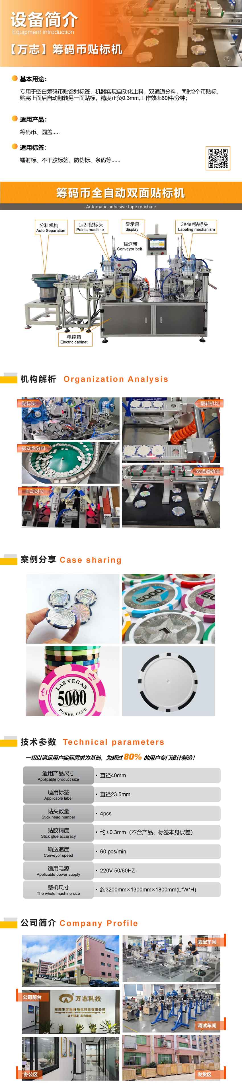 專用於空白(bái)籌碼幣貼(tiē)鐳射標(biāo)簽,機(jī)器實現自動化上料,雙通道分料,同時2個幣(bì)貼標,貼完上麵後自動翻轉另一麵(miàn)貼標,精度(dù)正負0.3mm,工作效率(lǜ)60件/分鍾