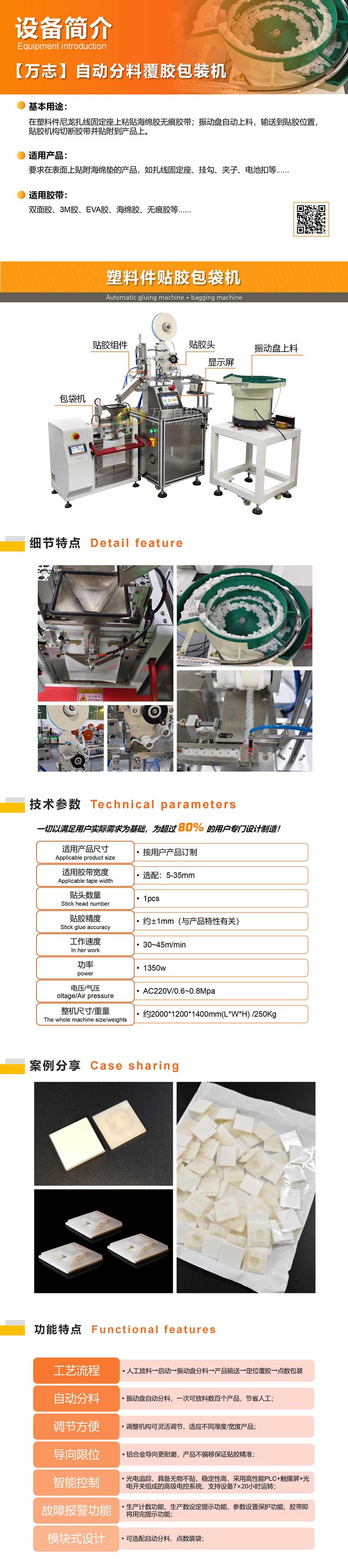 基本功能 在塑料件(jiàn)尼龍紮線固定座上粘貼海綿膠無痕膠帶;振動盤自動上料,輸送到貼膠位置(zhì),貼膠機構切斷膠帶並貼附到產品上。