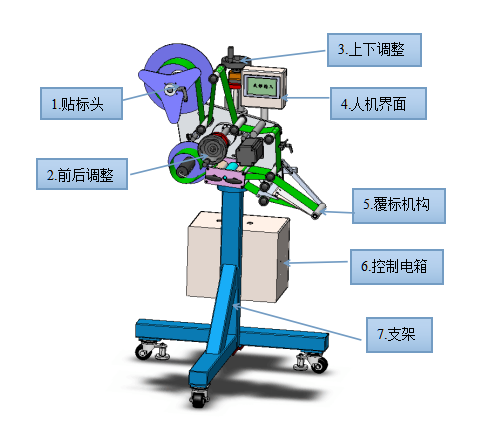 3)上下調整機構:調整貼標頭上下,匹配流(liú)水線的(de)高度。