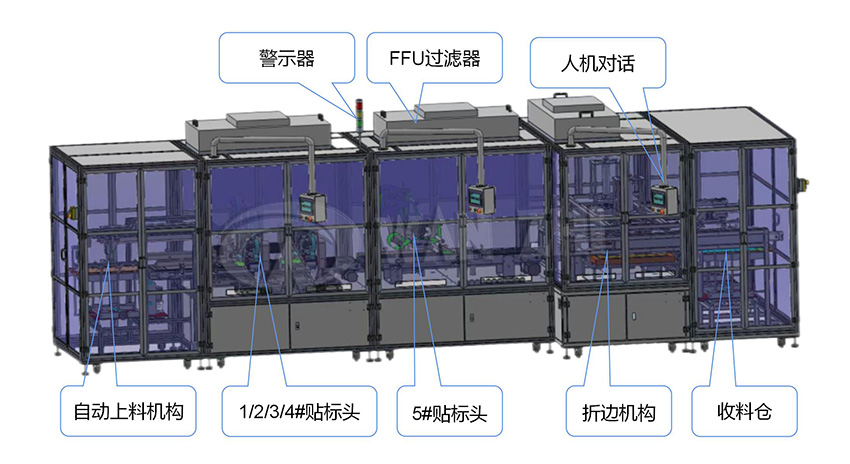 現場布局(jú)簡單,產品切換(huàn)方便。整線包含自動上料機、貼標機、搬運模組、壓(yā)合折邊機、收料機。